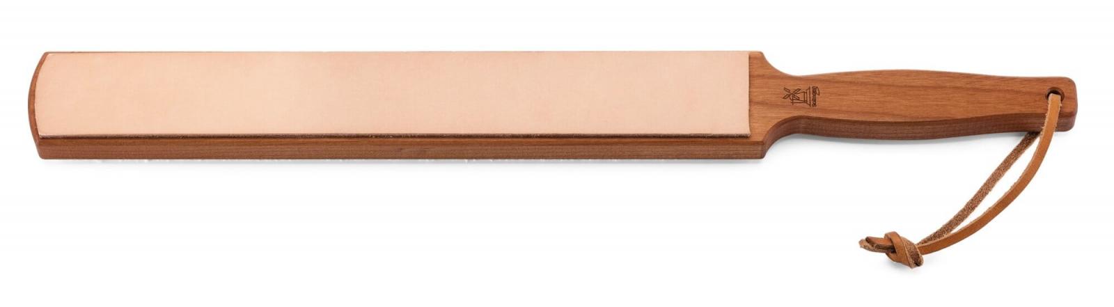 Der Streichriemen wird im Anschluss an das Schärfen der Küchenmesser auf dem Wasserschleifstein eingesetzt, um die Klingen fein zu entgraten und sauberzuschleifen – Polierschleifen, nennt das der Messerfachmann. Der Holzkörper aus gedämpftem und glatt geöltem Kirschbaumholz ist zur einen Seite mit einem vegetabil gegerbten, weichen Rindleder (20 Micron) bezogen. Auf der rauen Seite ist ein chromgegerbtes, härteres Rindleder mit Diamantine-Pulver bestäubt, einem feinen Aluminiumoxid-Schleifpulver (10 Micron). Die weiche Seite bleibt naturbelassen und dient dem Feinabzug der Messerklingen. Da es von Natur aus einen leichten Fettanteil mitbringt, bleibt das Leder lange geschmeidig. Der Streichriemen wird anders benutzt als man es vom Wetzstahl gewohnt ist: Ziehen Sie das Messer nicht gegen die Schneide, um während der Schärfvorgänge weder der Klinge noch dem Leder zu schaden. Halten Sie das Messer immer so, als ob Sie damit Butter leicht verstreichen wollten, und wechseln Sie die Ziehrichtung immer über den Klingenrücken.
